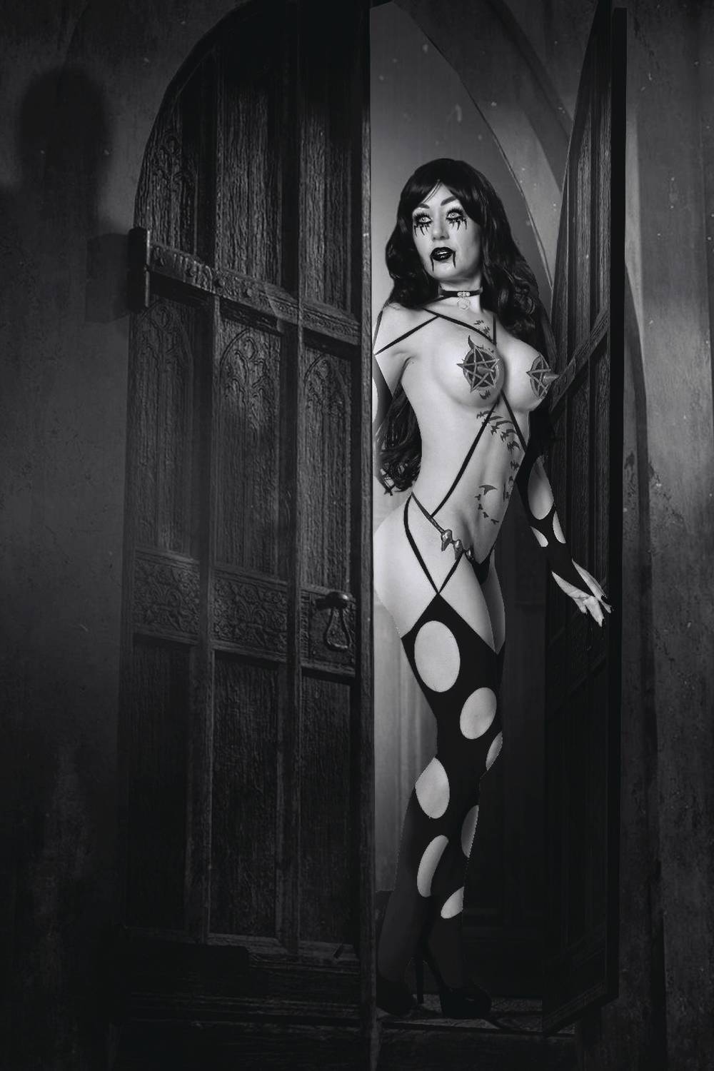 Photographed and Photo magic of SGH brings you an image of Raven Hex with an homage to classic horror movies. This limited edition photocover issue comes bagged boarded and signed by artist Jim Balent