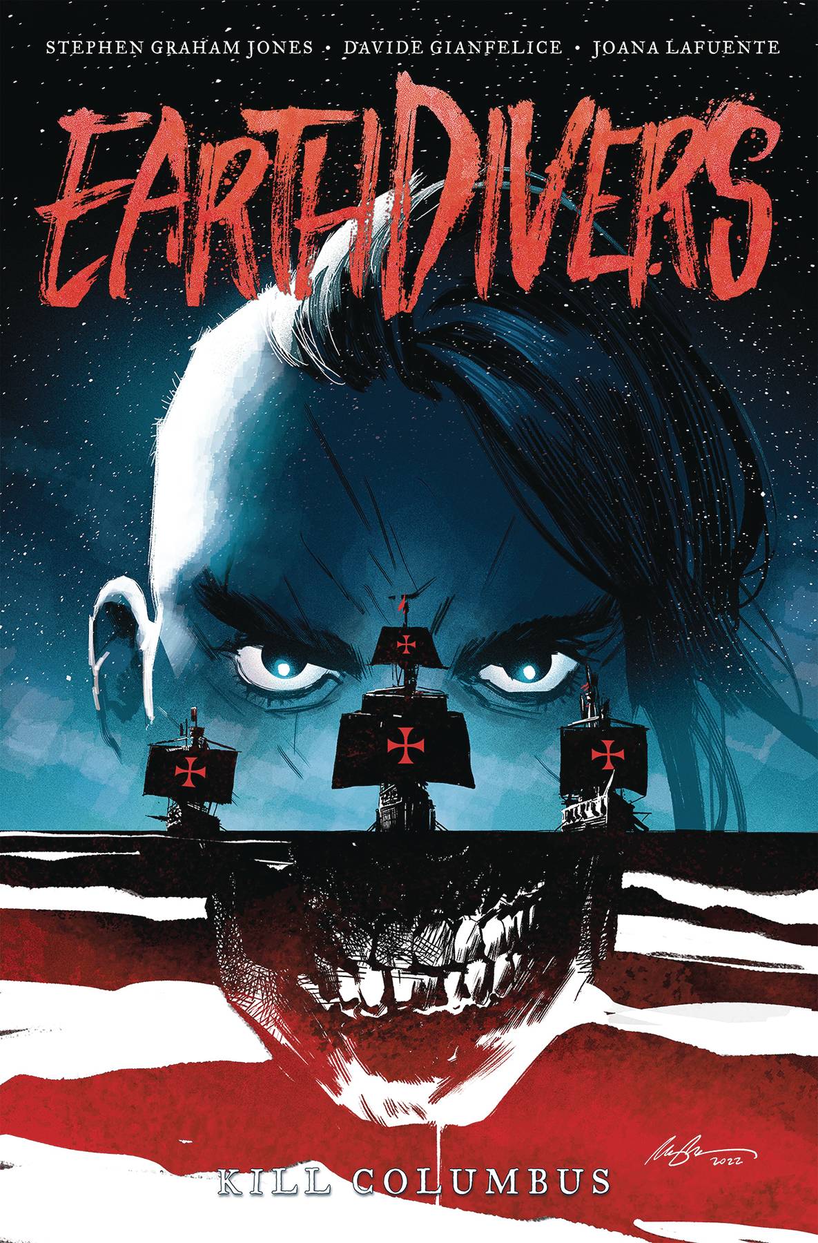 Join or die! New York Times bestselling author Stephen Graham Jones and artist Davide Gianfelice are back in action for the next chapter of their heart-pounding historical sci-fi slasher EARTHDIVERS!A team of time traveling Indigenous survivors had one goal: save the world from an American apocalypse by sending one of... Read More →